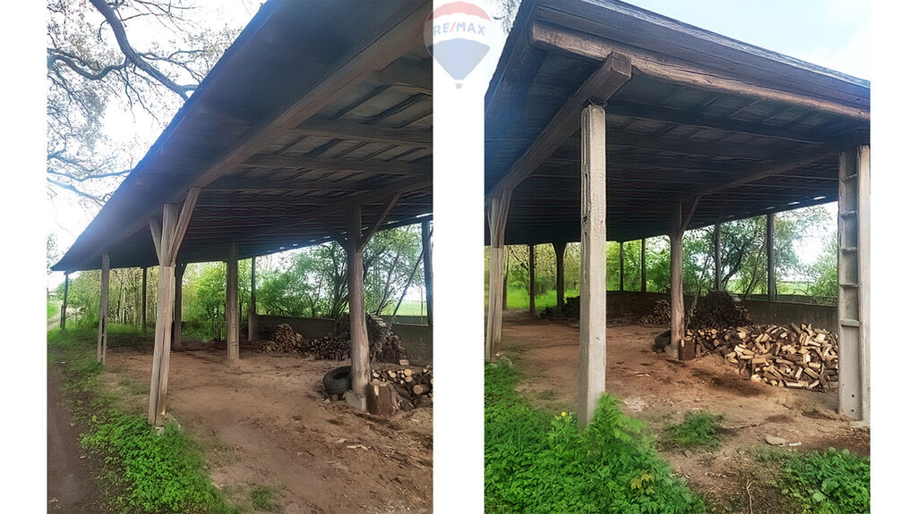 Na działce znajduje się solidna wiata, zadaszona i oparta na